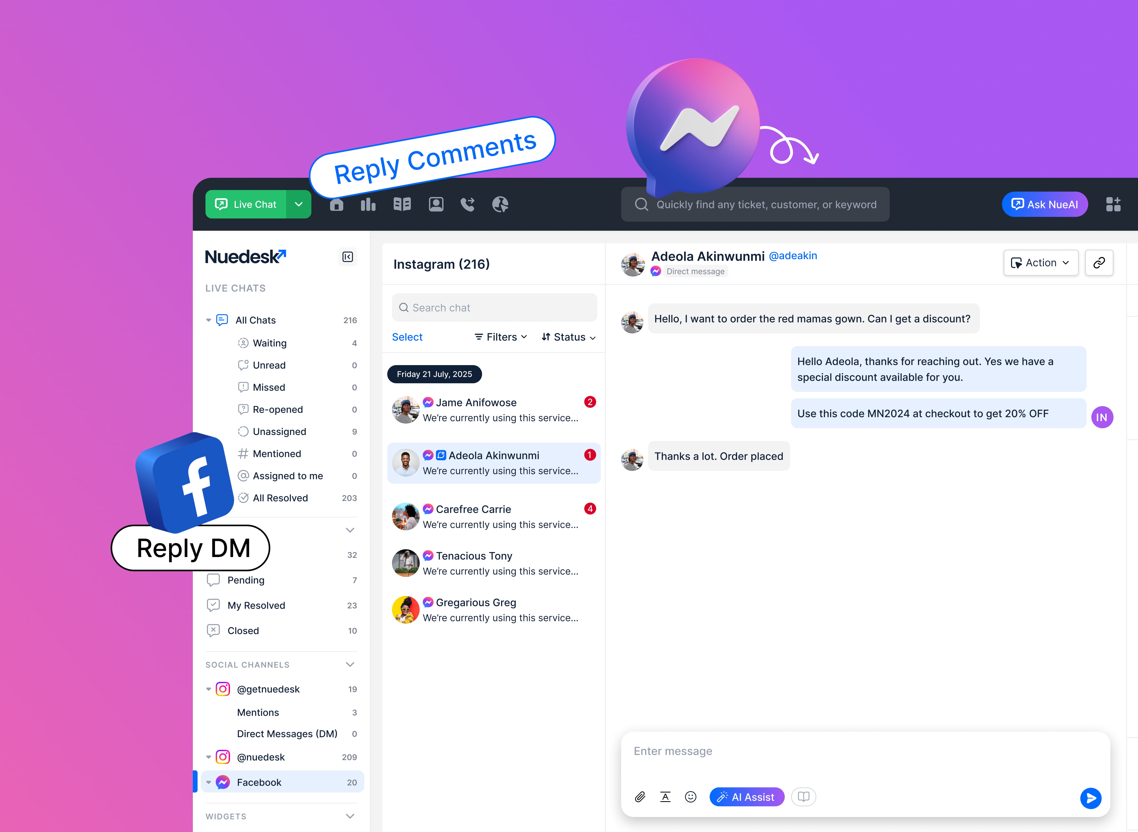 Handle Messenger conversations, page comments, and ad replies from your Nuedesk inbox. Never switch between apps again.